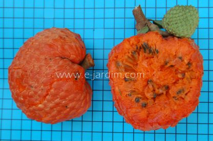 Deliciosos frutos de 8-9 cm de diâmetro, dotados de casca finíssima comestível, com polpa intensamente laranja-avermelhada envolvendo pequenas sementes escuras. De consistência pastosa, seu sabor é muito adocicado, lembrando em cor, textura e sabor doce de abóbora. A árvore é de pequeno porte (2-3 m em cultivo), e apresenta folhas relativamente pequenas (3-5 cm) e alguns espinhos longos, pouco agressivos.