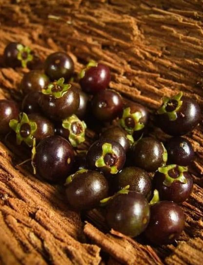 Pequenos frutos arredondados (subglobosos), de casca roxa escura rígida e lisa, encerrando polpa clara, amarelada e adocicada. As sépalas (lobos do cálice) são persistentes (no fruto maduro) e reflexas (dobradas para trás). A planta adulta é um arbusto ou arvoreta, com 1-4 metros de altura quando cultivada (na natureza atinge porte um pouco maior).