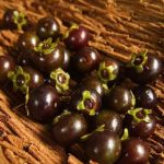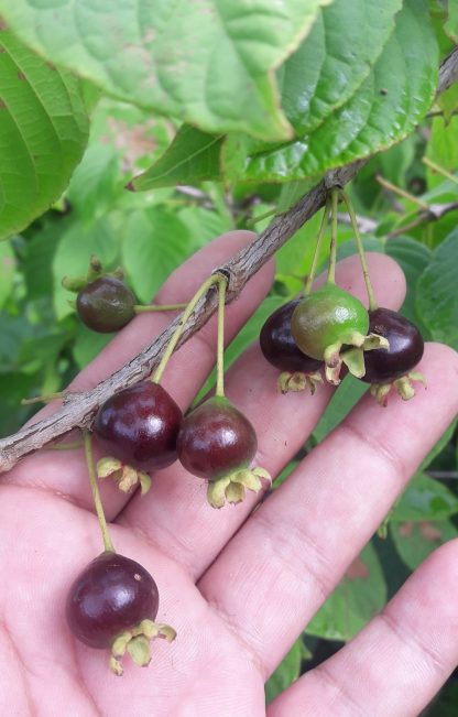 Pequenos frutos arredondados (subglobosos), de casca roxa escura rígida e lisa, encerrando polpa clara, amarelada e adocicada. As sépalas (lobos do cálice) são persistentes (no fruto maduro) e reflexas (dobradas para trás). A planta adulta é um arbusto ou arvoreta, com 1-4 metros de altura quando cultivada (na natureza atinge porte um pouco maior).