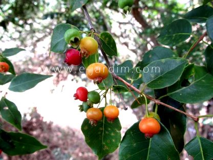 Pequenos frutos esféricos, de casca fina brilhante, passando do amarelo ao vermelho-escarlate na maturação para a cultivar selecionada pelo E-jardim (ver 1a e 2a fotos). Seu sabor é doce e agradável, suavemente picante. A planta é uma arvoreta, de folhagem brilhante, com tronco fendido e descamante da mesma forma que outras espécies congêneres.