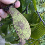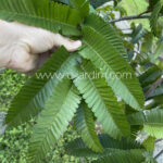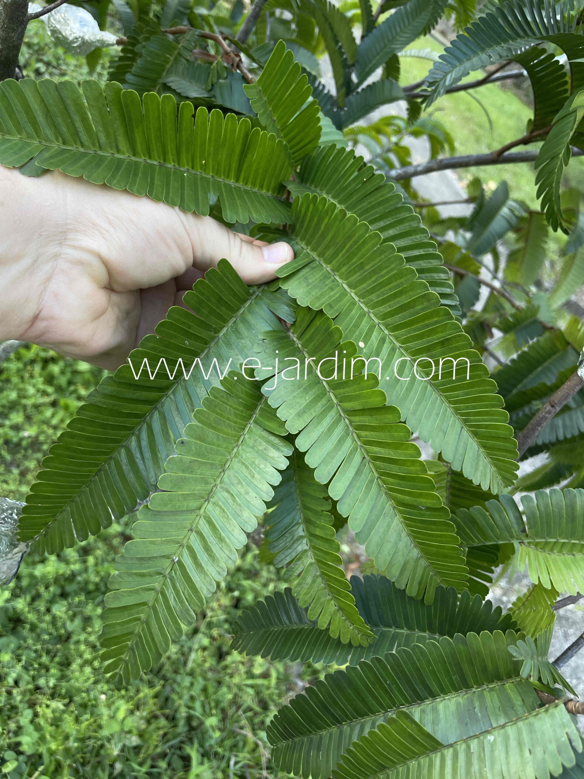 As folhas são compostas e paripinadas, com numerosos folíolos oblongos dispostos em fileiras regulares, formando uma folhagem delicada e elegante. As brotações novas surgem pendentes, formando verdadeiros “lenços” vegetais, inicialmente macios e de coloração róseo-avermelhada clara, antes de se tornarem verdes com o amadurecimento — efeito ornamental muito apreciado em árvores da tribo Detarieae.
