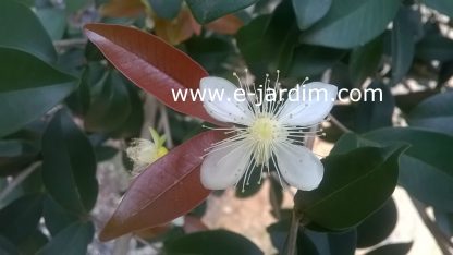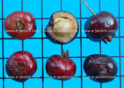 Pequenos frutos de c. 1,5 cm de diâmetro, arredondados e fortemente achatados nas extremidades, com casca lisa e fina, dotados de sépalas perpendiculares no ápice (ver 2a. foto). A coloração da casca passa de vermelha a arroxeada quase negra na maturação, e a da polpa (de sabor doce) é esbranquiçada (ver fotos). A planta é um arbusto ou arvoreta com pouca altura (2-4 m), de folhagem densa e verde-escura, que contrasta com brotações jovens marrom-avermelhadas e flores brancas (3a. imagem).