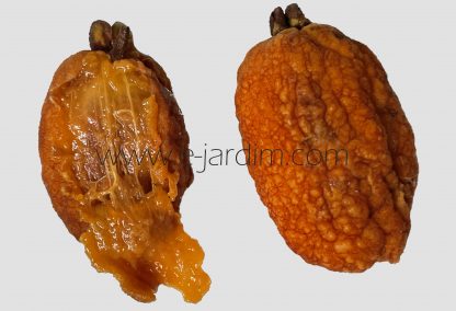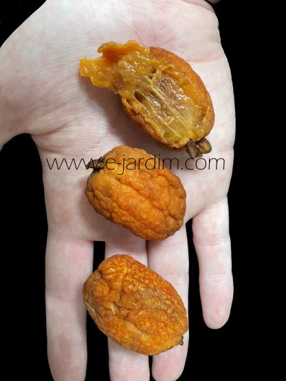 Fruto grande (4-6 cm comprimento x 2,5-3,5 cm largura), de superfície rugosa intensamente alaranjada, com casca finíssima comestível, contendo polpa muito suculenta da mesma cor, de agradável sabor agridoce. São alongados e têm costelas (divisões) pouco visíveis, além de sépalos na extremidade, revelando distante parentesco com o pitangão ou pitangatuba (Eugenia selloi). Em termos de sabor, é menos ácido que este último. Seu formato, textura e cor também lembram um pouco o cajá-mirim (Spondias mombin), razão de seu nome popular.