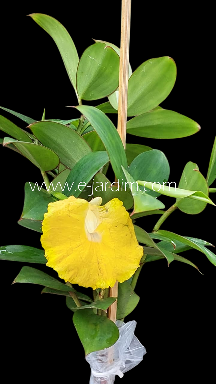 Flores amarelas luminosas, grandes (em comparação com o tamanho da planta) e delicadamente onduladas, que surgem solitárias entre as folhas, criando um efeito ornamental incomum entre as plantas da família Costaceae. O labelo amplo e vistoso — de coloração amarelo-limão com centro mais claro e por vezes marcado por delicadas estrias — é a principal atração da espécie, lembrando pequenas flores tropicais suspensas na folhagem.