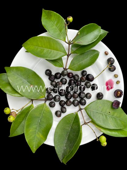 Frutos de coloração roxa-escura intensa, ricos em antocianinas, com polpa suculenta e sabor doce-acidulado muito agradável. Medem em geral cerca de 1,5 cm de diâmetro, sendo relativamente grandes para o gênero. A intensa pigmentação evidencia o alto teor de compostos fenólicos, destacando-se como uma das melhores espécies de Myrcia para consumo in natura.