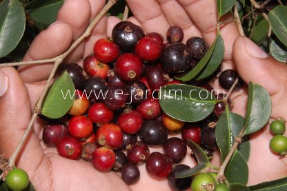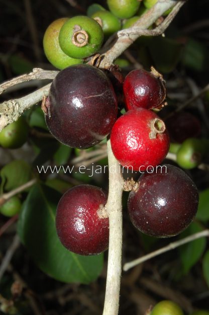 Graciosos frutos de ca. 1,5 cm, arredondados e multicoloridos (vermelho-intensos a quase negros, conforme o estágio de maturação). São coroados no ápice por um pequeno vestígio de uma estrutura floral denominada caliptra (ver fotos). Possuem casca fina, polpa suculenta de sabor bastante doce quando maduros, com marcante presença de taninos. A planta é uma arvoreta (1,5-4 m), com folhas muito brilhantes na face superior, dotada de tronco marrom acinzentado cuja casca desprende-se em placas.