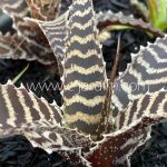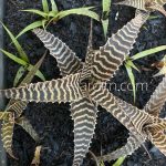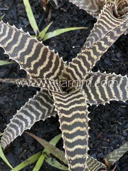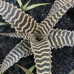 Bromélia ereta de folhas espessas, de fundo vermelho-bordeaux com faixas irregulares finas acinzentadas, compostas por minúsculas escamas. Inflorescência verde, ereta.
