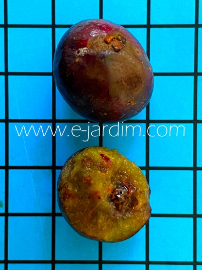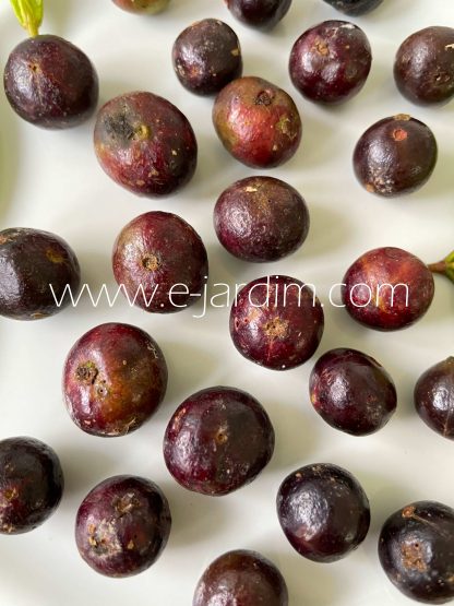 Frutos subglobosos (quase esféricos), com casca escura negro-azulada, de aproximadamente 2 cm de diâmetro (ver 1a foto), contendo polpa aquosa adocicada e duas sementes pequenas, que se destacam facilmente. A pequena árvore é muito ornamental, possuindo tronco liso e descamante como as jabuticabeiras e folhas grandes e buladas (com bolhas), marrom-avermelhadas quando jovens (2a imagem).